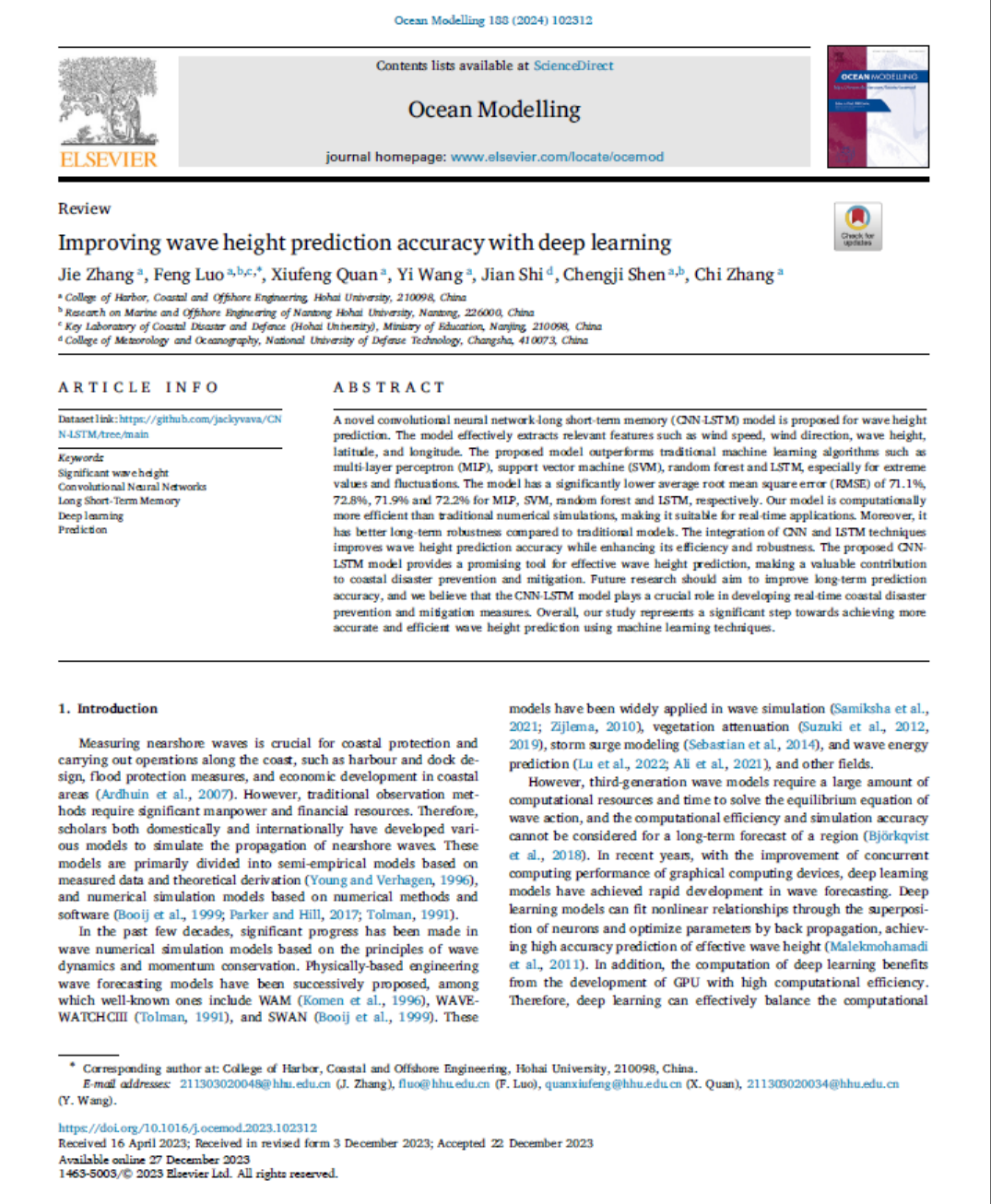 Zhang J, Luo F *, Quan X, Wang, Y, Shi, J , Shen, C, and Zhang, C. Improving wave height prediction accuracy with deep learning[J]. Ocean Modelling, doi: https://doi.org/10.1016/j.ocemod.2023.102312