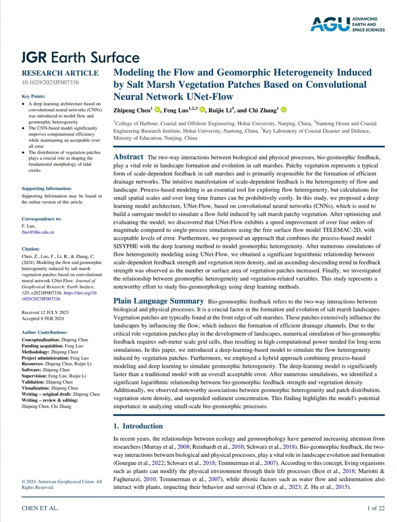 近日,国际地学知名期刊Journal of Geophysical Research-Earth Surface在线发表了港口海岸与近海工程学院的最新云开电竞app下载地址“Modeling the Flow and Geomorphic Heterogeneity Induced by Salt Marsh Vegetation Patches Based on Convolutional Neural Network UNet-Flow”(基于卷积神经网络UNet-Flow的盐沼植被斑块引起的流动和地貌异质性模拟研究),该成果第一作者是我院博士研究生陈治澎,通讯作者罗锋副教授。