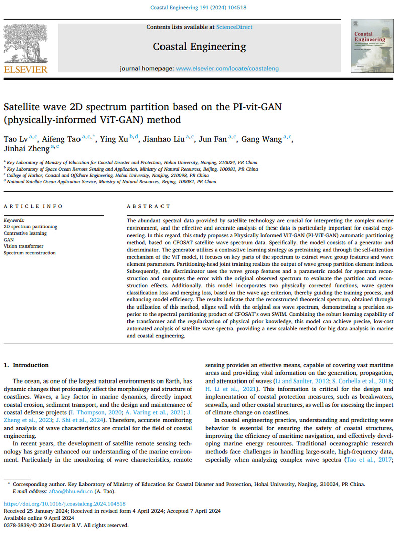 Tao Lv, Aifeng Tao*, Ying Xu, Jianhao Liu, Jun Fan, Gang Wang, Jinhai Zheng, Satellite wave 2D spectrum partition based on the PI-vit-GAN(physically-informed ViT-GAN) method, Coastal Engineering, Volume 191, 2024, 104518, ISSN 0378-3839, https://doi.org/10.1016/j.coastaleng.2024.104518.