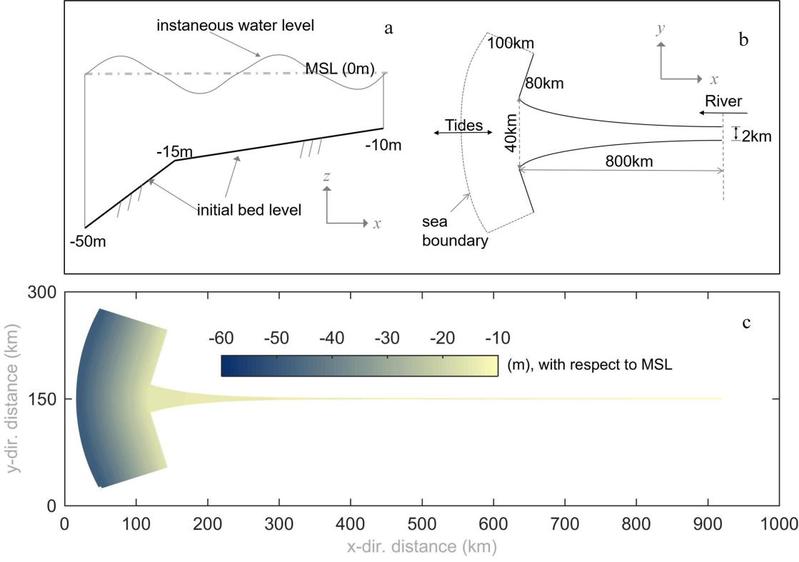 研究团队通过海岸动力地貌学数值模拟技术对泥沙组分对长周期、大尺度河口地貌演变及泥沙分布进行了深入研究。团队首先分析了全球多个河口的泥沙组分空间分布情况,发现泥沙组分与河口中长期地貌之间存在紧密联系。为了揭示两者的关系,论文以长江口为例建立了大尺度河口的二维概化模型(图1),通过对模型结果的分析发现粘性泥的加入对初始地貌演化的加速作用(图2),但地貌演化随时间的加速会逐渐变缓并倾向于达到某种平衡(图3),在地貌演变的过程中粘性泥更多的聚集在河口的口门附近,而非粘性沙在陆侧的占比显著增加,这与长江口现场观测的数据总体相吻合。论文针对泥沙组分对河口中长期地貌演化的影响进行了量化研究,加深了对河口泥沙输运和中长期地貌演变的机制认识,指出中长期河口地貌演变模拟需要对泥沙的组分进行更准确的表征,研究可为河口整治、航道工程等提供一定的科技支撑。