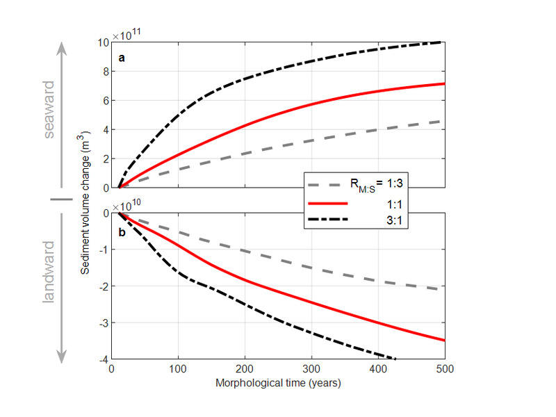 图3 不同沉积物类型通过河口的累积沉积物体积运输:(a) 向陆地的沉积物运输(正值),以及 (b) 向海洋的沉积物运输(负值)。