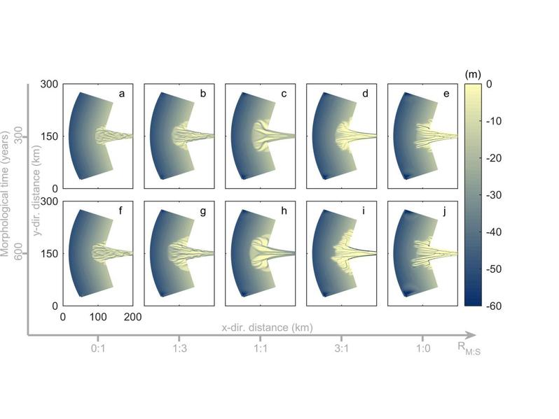 图2 不同组分系统在300年后(a-e)和600年后(f-j)的形态演变(口门附近),RM:S代表泥沙比例。
