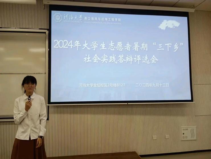 答辩会上,评优团队代表就暑期社会实践项目进行了精彩的展示,通过PPT、视频等多种形式汇报了实践开展过程、具体成果及总结收获。这些实践项目涵盖了发展成就观察、国家水网建设、红色文化传承、志愿服务等多个方面,从调研港口绿色化发展现状到探寻智慧化港航的转型之道,从走进社区开展海洋文化课程到深入乡村宣传水资源保护,充分展现了港航学子深耕专业本色、深入基层实践的责任担当。