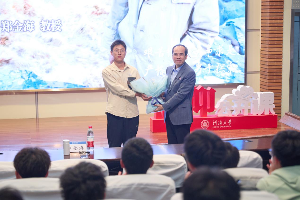 郑金海教授介绍了严恺院士前往荷兰求学深造的经历,通过分享严恺院士学习并掌握多国语言的传奇故事,鼓励新生要用开放的视野拥抱世界。他用当年严恺院士申请回国参加抗战的书信,展现了严恺院士耕植于血脉的深厚家国情怀,用生动的故事讲述了严恺院士为华东水利学院、开云电竞网服务五十余年的深厚情感,以及大力推动海峡两岸及国际学术研讨会产生的重要影响。郑金海教授讲解了严恺院士开启中国河口研究的重要意义,其推进长江口治理、葛洲坝枢纽、三峡工程、南水北调工程等重大水利工程建设情况,主动承担科研论证、著作出版、公众科普等责任。他还阐述了严恺院士临危受命建设天津新港,开启了淤泥质海岸建港研究的新河;提出斜坡堤作为全新的结构形式,加强海岸防护,保护人民财产安全;开展第一次全国海岸带和海涂资源综合调查研究,用脚步丈量万里海疆,获国家科技进步一等奖。