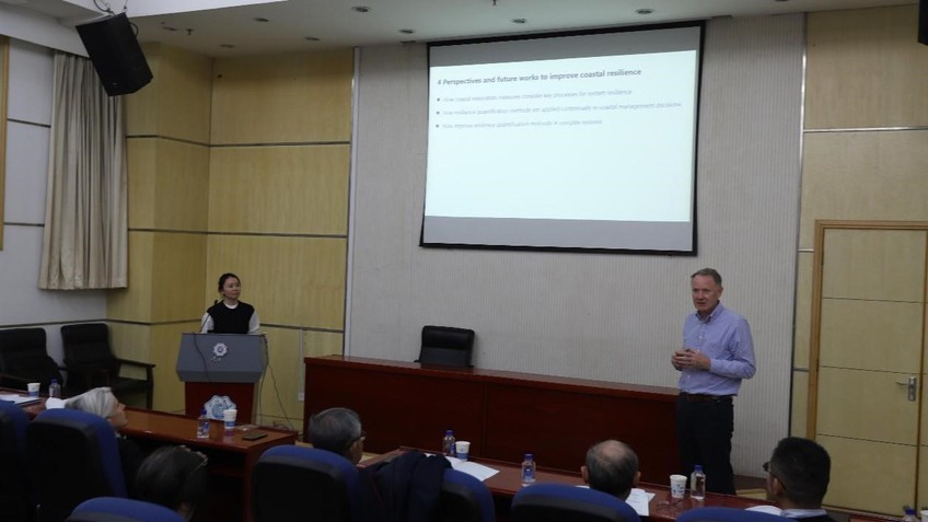 会议邀请了七位国内外知名专家做主旨报告。研讨会上半场由新西兰奥克兰大学Karin Bryan院士主持,南安普顿大学Ian Townend院士以“Some ideas on Coastal Resilience”为题,分享了关于海岸韧性提升的重要理论框架与实践策略;华东师范大学李秀珍教授作了题为“Restoration of Coastal wetlands in China: Chances and Challenges”的报告,介绍了中国湿地生态系统修复的最新研究进展;奥克兰大学Giovanni Coco教授的报告以“Resilience in coupled human-physical system”为题,深入探讨了耦合人类活动与自然系统的海岸韧性研究;厦门大学陈鹭真教授的报告“Mangrove blue carbon budget based onfield observation: A case in Zhangjiang long-term mangrove station”基于湛江红树林长期观测站的研究,分析了红树林蓝碳估算的关键成果。