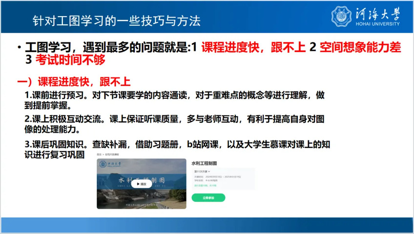 本次同舟课堂依旧延续港航院朋辈帮扶的优良传统,通过优秀学长学姐讲解分享备考经验,帮助2024级港航学子更好地应对期中考试,更好掌握高数、工图、四六级、python等学科的备考方法,提升应试能力,提高复习效率,在期中考试中取得令人满意的成绩。