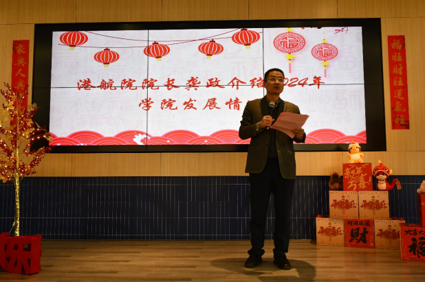 硕果累累辞旧岁,同心共力启新篇!在联欢会开始前,学院特别邀请了校长郑金海为教职工们带来新年致辞,学院院长龚政介绍2024学院情况,学院党委书记张雪刚主持联欢会。郑校长深情回顾了学校在过去一年里取得的丰硕成果,并对全体教职工的辛勤付出表示衷心感谢。同时,他对新一年学校、学院的发展寄予厚望,激励大家继续砥砺奋进,共同推动学校学院发展迈上新台阶。随后,学院院长龚政回顾了一年来港航院在教学、科研和学科建设等方面取得的斐然成绩,并展望了学院发展的美好蓝图。港航院退休教工支部书记舒红缨对学院一直以来对退休教师的关心关爱表示感谢,对学院一年来取得优异的成绩表示祝贺,也期待着在新的一年里取得更大的成绩。