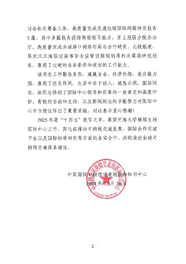我院靳闯副研究员于2024年8月至2025年7月借调至交通部下属事业单位中国国际可持续交通创新和知识中心(以下简称“国际中心”),协助开展交通部国际合作、全球可持续交通高峰论坛、北极航道、全球港口网络布局、国际道路运输等相关工作。