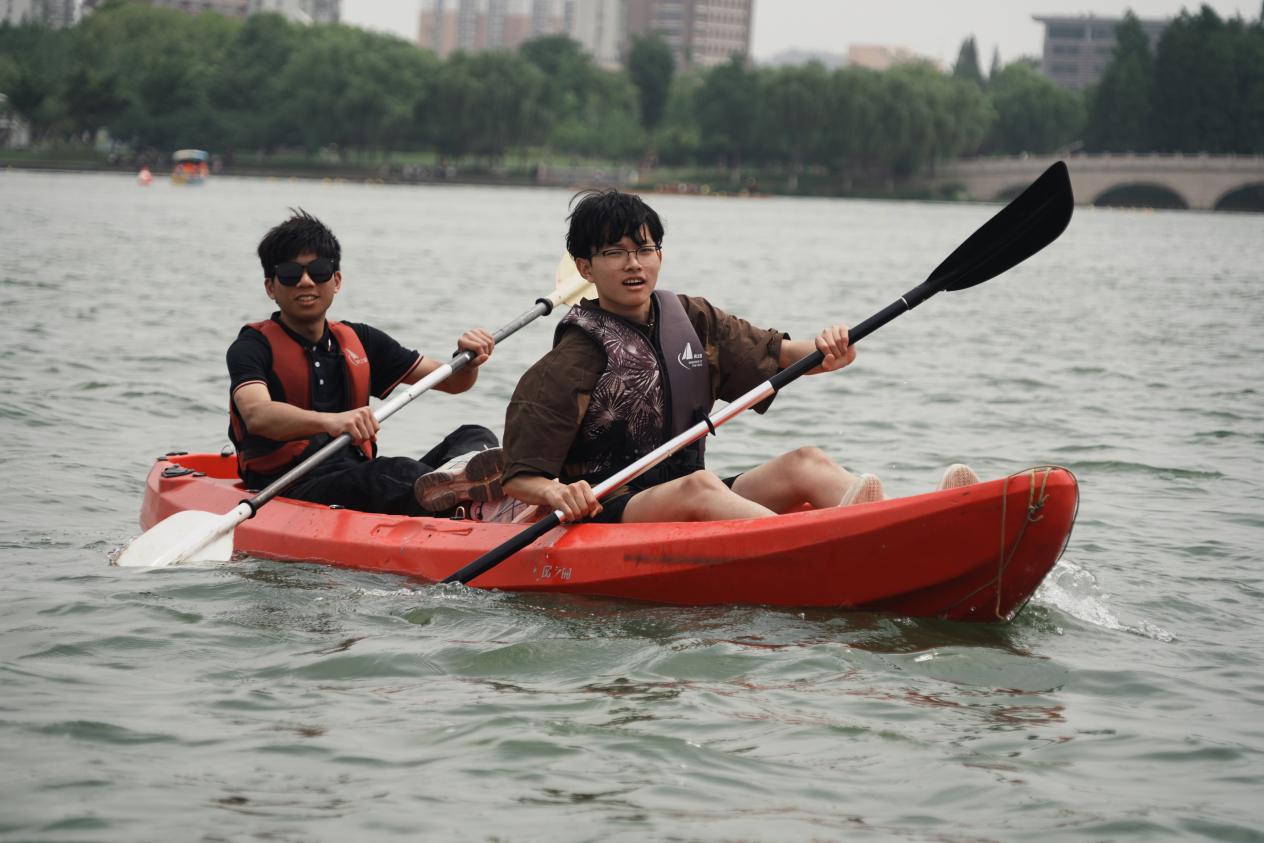 在体验皮划艇项目中,同学们两两一组,默契地一左一右的划行,感受着风浪带来的愉悦感,也能够自由控制船速,在急速冲行后也能放松身心躺在艇中,享受漂浮湖上的松弛。在划行过程中,不同艇上的同学们也互相帮助,分享划行技巧,相互合影留念。同时与帆船上风趣的教练进行互动,在百舸争流中保持着欢声笑语,增强了凝聚力与合作力。