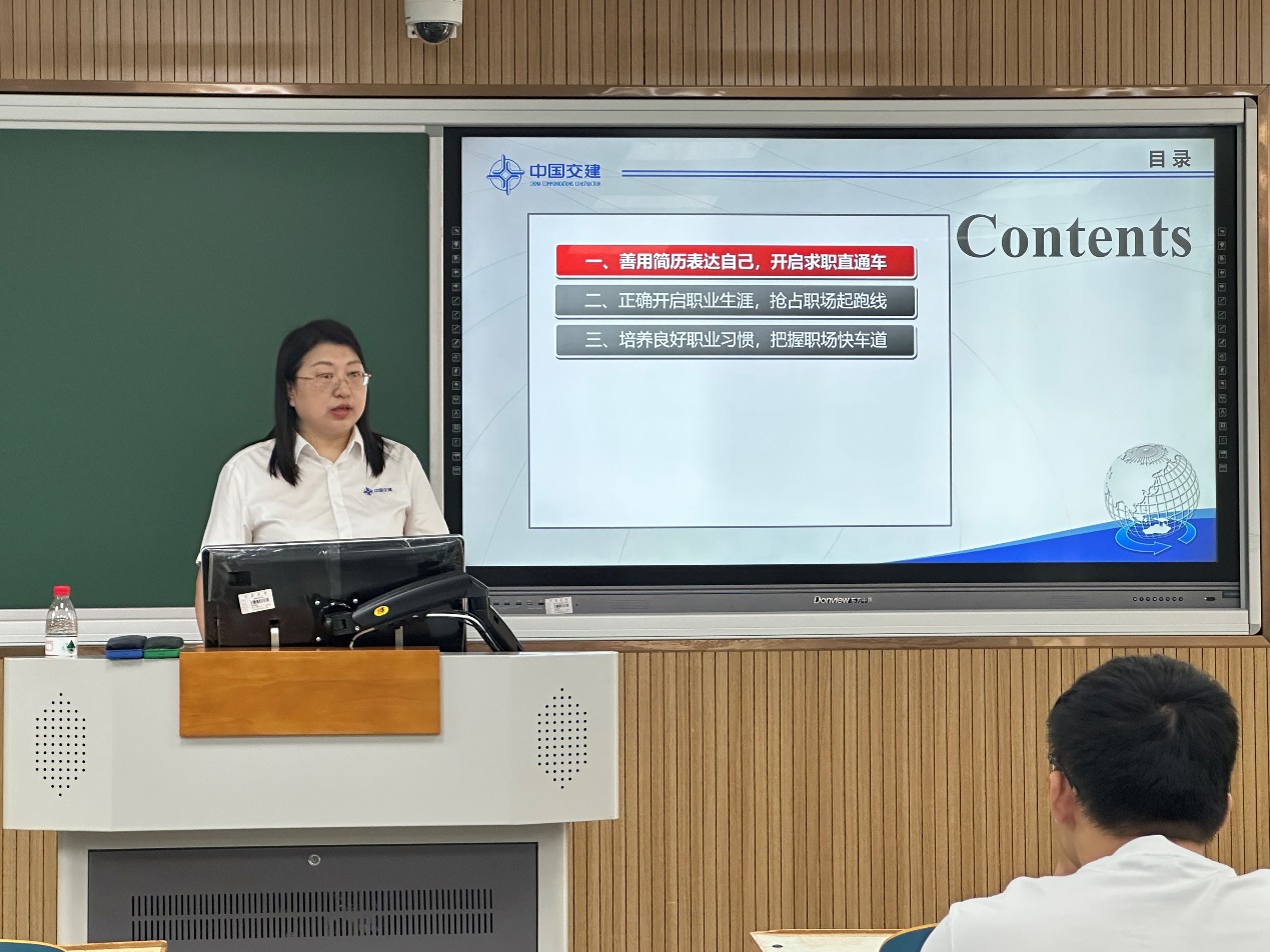 6月15日下午,我院“航行并肩”生涯工作室企业导师,中交三航局第三工程有限公司人力资源部、党委组织部副经理王珍来到江宁校区,为2022级本科生带来职业生涯规划讲座。学院党委副书记王玲主持。