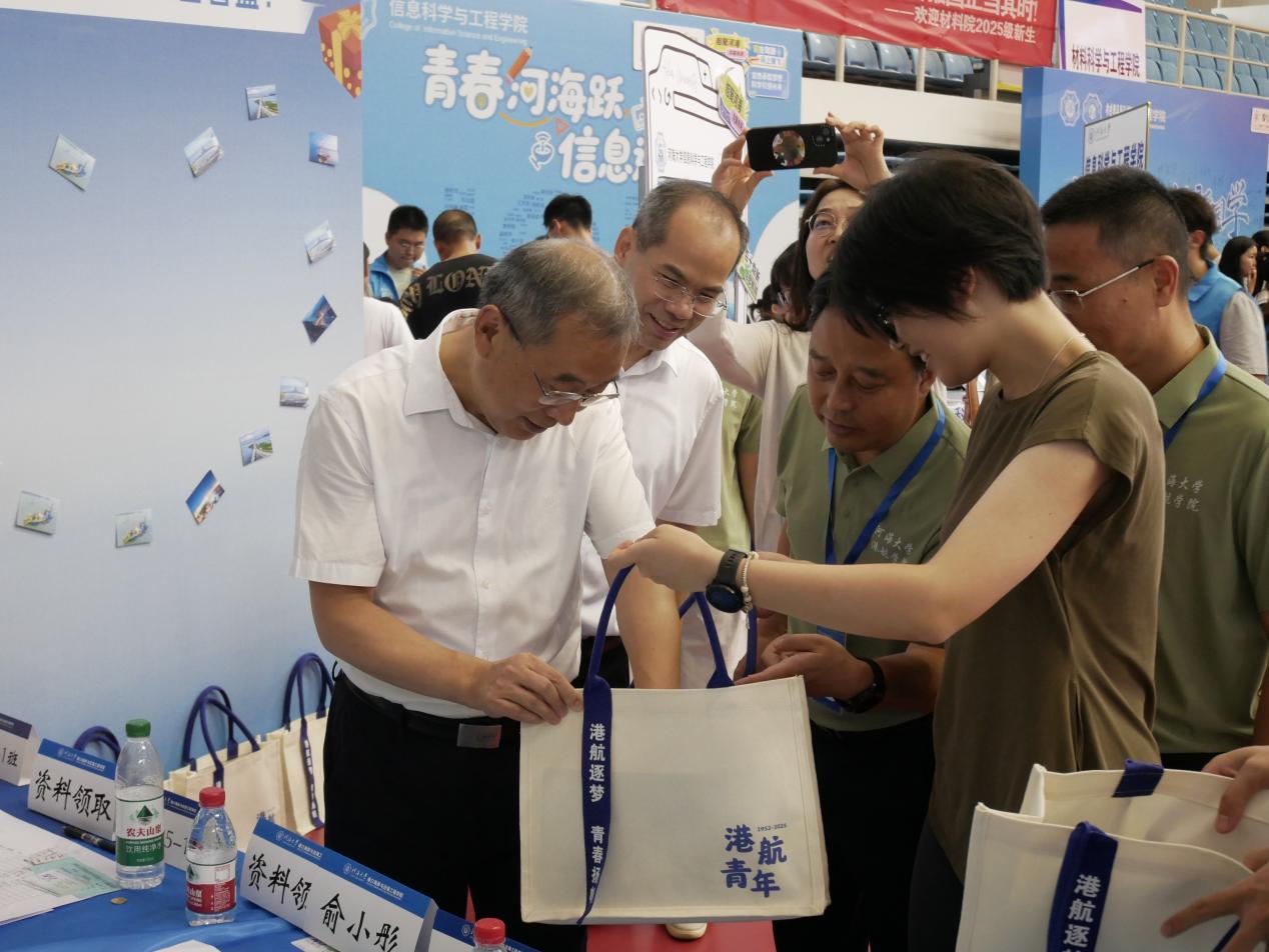 学院党委书记张雪刚、院长龚政、党委副书记王玲及学院2025 级本科新生班导师、辅导员热情迎新,把迎新大礼包亲手交到每位新生手里。龚政院长关切询问新生来自哪里,结合学生专业畅聊未来发展方向;张雪刚书记提醒新生 “不管是学业上还是生活上有问题,随时找学院、找老师”;王玲副书记现场解答新生的疑问,帮助新生适应新的环境。校院领导和老师们的关心,让刚到学校的新生少了陌生感,感受到了港航院的温暖。