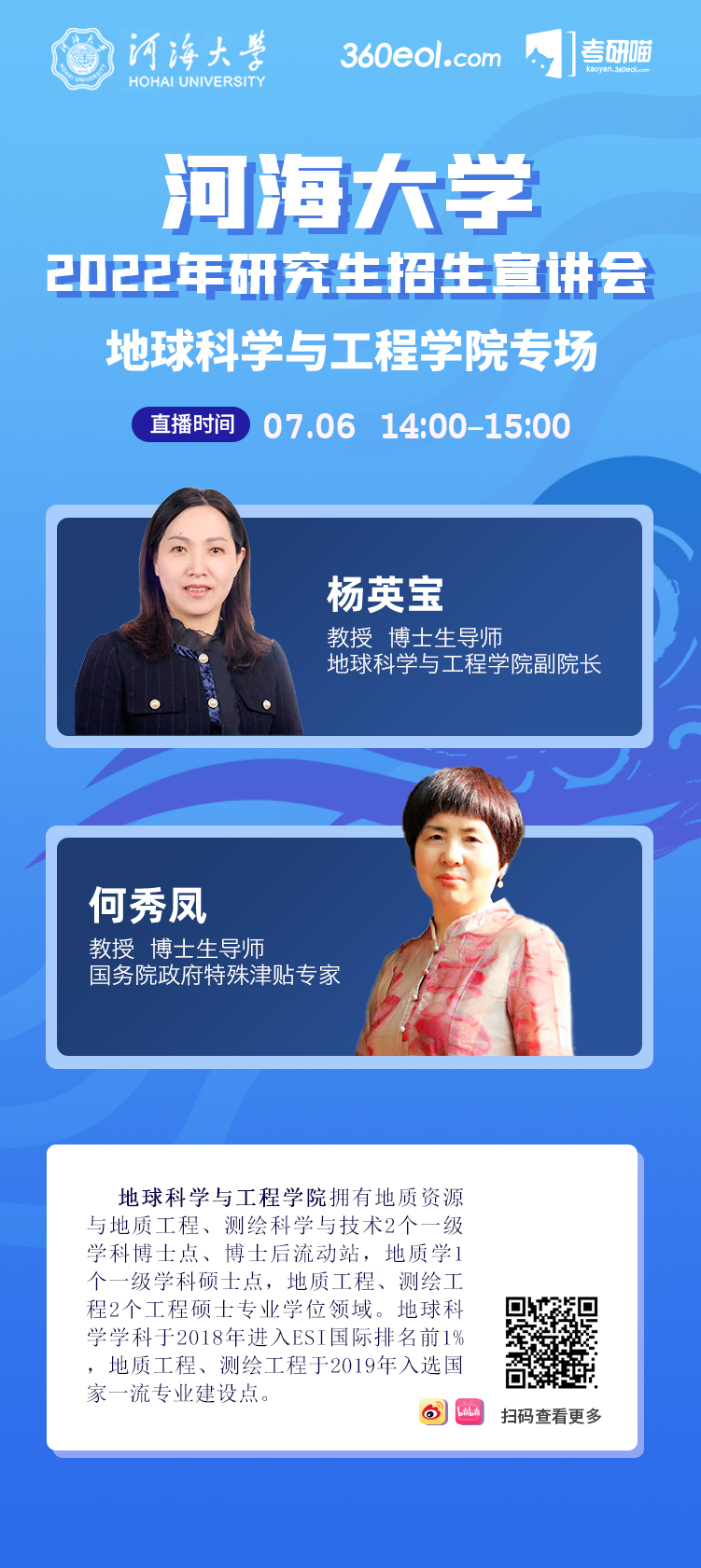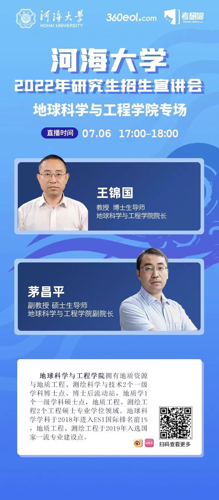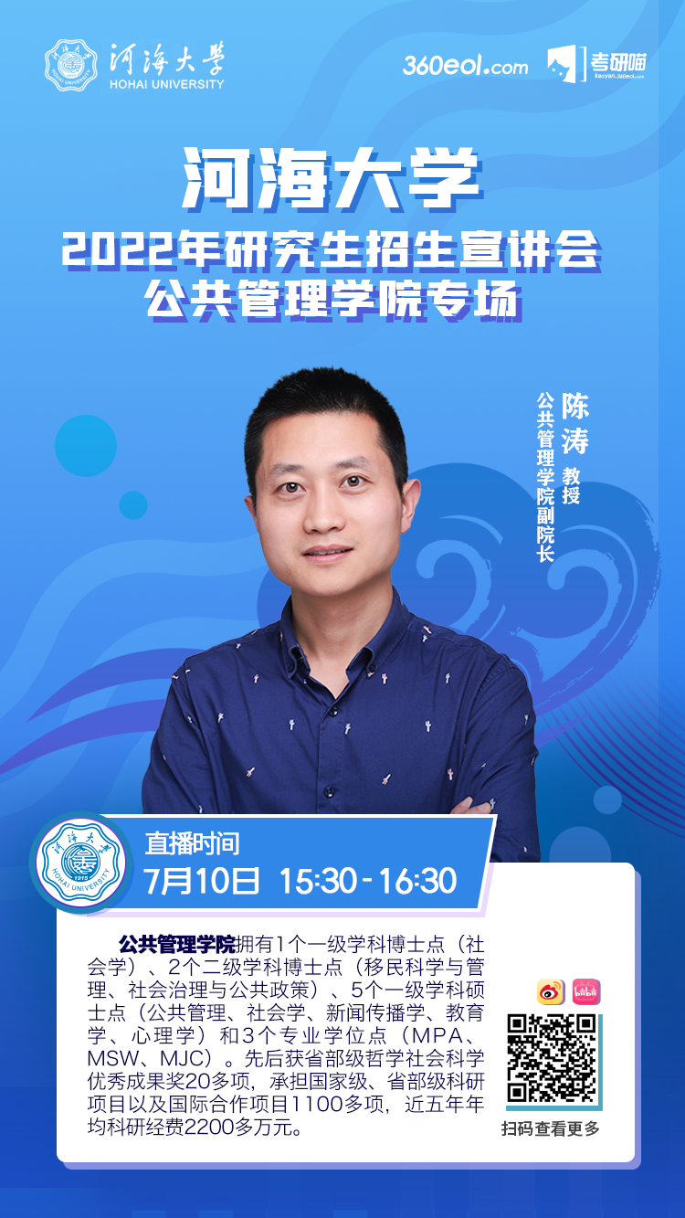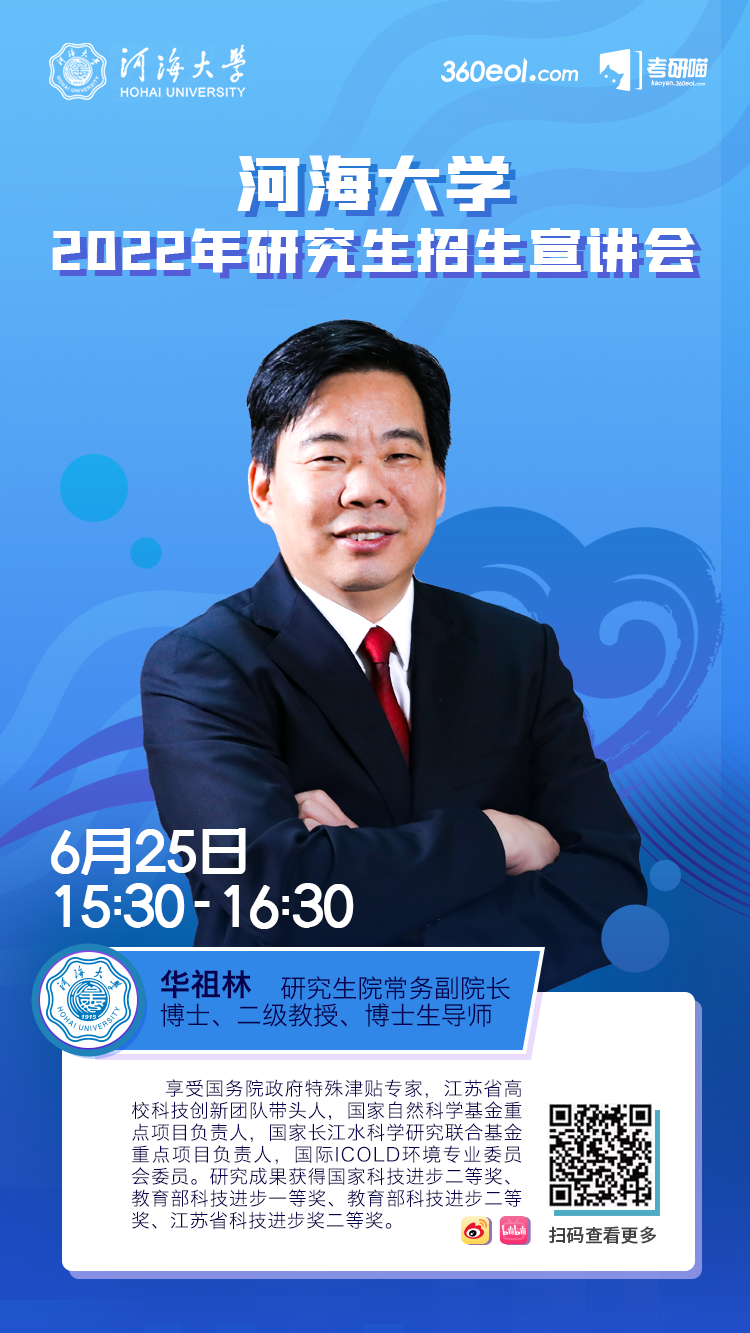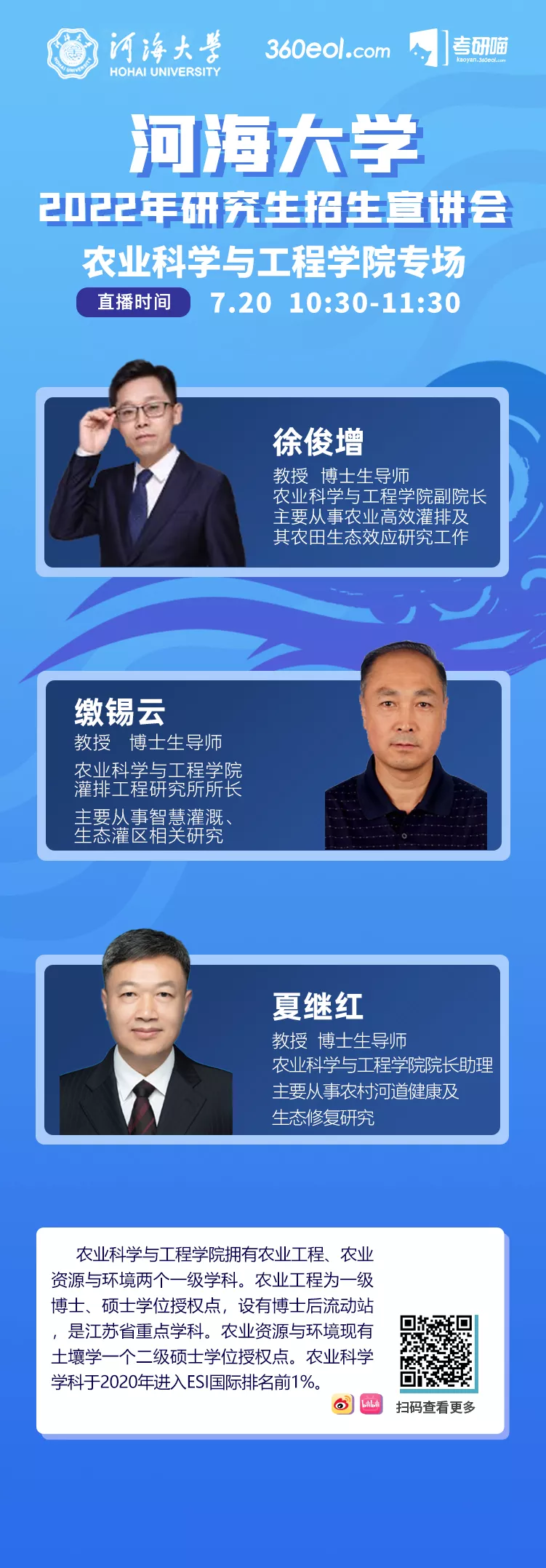 我校将于2021年7月20日进行农业科学与工程学院2022年研究生招生在线宣讲会,时间为上午10:30-11:30,宣讲人为农业科学与工程学院副院长徐俊增教授、灌排工程研究所所长缴锡云教授以及院长助理夏继红教授。宣讲会将对开云电竞网农业科学与工程学院研究生教育情况和招生政策进行介绍,在线互动回答,欢迎各位考生关注,扫码观看。