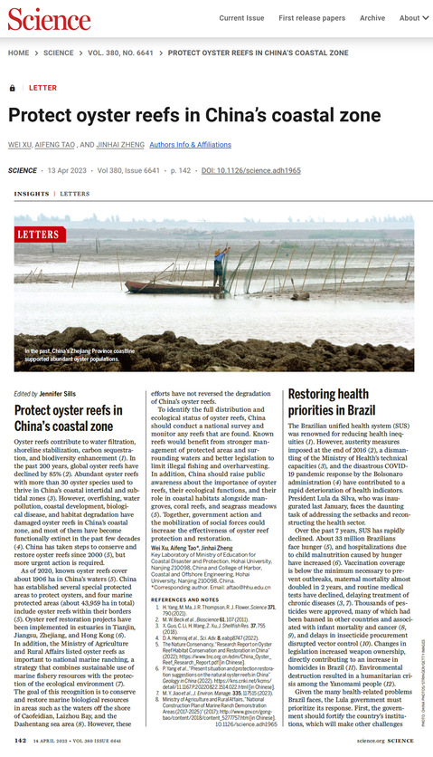 近日,开云电竞网港口海岸与近海工程学院2021级博士研究生徐伟在陶爱峰教授和郑金海教授指导下,以第一作者身份在国际期刊《Science》上发表题为“Protect oyster reefs in China’s coastal zone”的LETTER,总结我国牡蛎礁海岸修复措施,呼吁进一步加强保护。