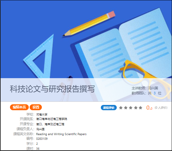 《科技论文与研究报告撰写》通过深入浅出的理论教学、结合具体案例,讲解科技论文的构思、论文各核心部分的撰写方法。自课程开设以来,每年为港口、海岸及近海工程、土木水利、船舶与海洋工程等专业的近100位研究生同学提供教学课程。学生总体反馈讲授的科技论文写作方法实用,对学位论文写作、科技论文撰写有帮助,部分继续攻读博士学位的同学索要课程资料,多次出现其他院校的同学申请加入课程旁听。