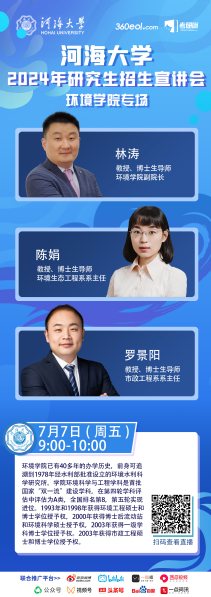 学院简介:环境学院已有40多年的办学历史,前身可追溯到1978年经水利部批准设立的环境水利科学研究所。学院环境科学与工程学科是首批国家“双一流”建设学科,在第四轮学科评估中评估为A类,全国排名第8,第五轮实现进位。1993年和1998年获得环境工程硕士和博士学位授予权,2000年获得博士后流动站和环境科学硕士授予权,2003年获得一级学科博士学位授予权。2003年获得市政工程硕士和博士学位授予权。