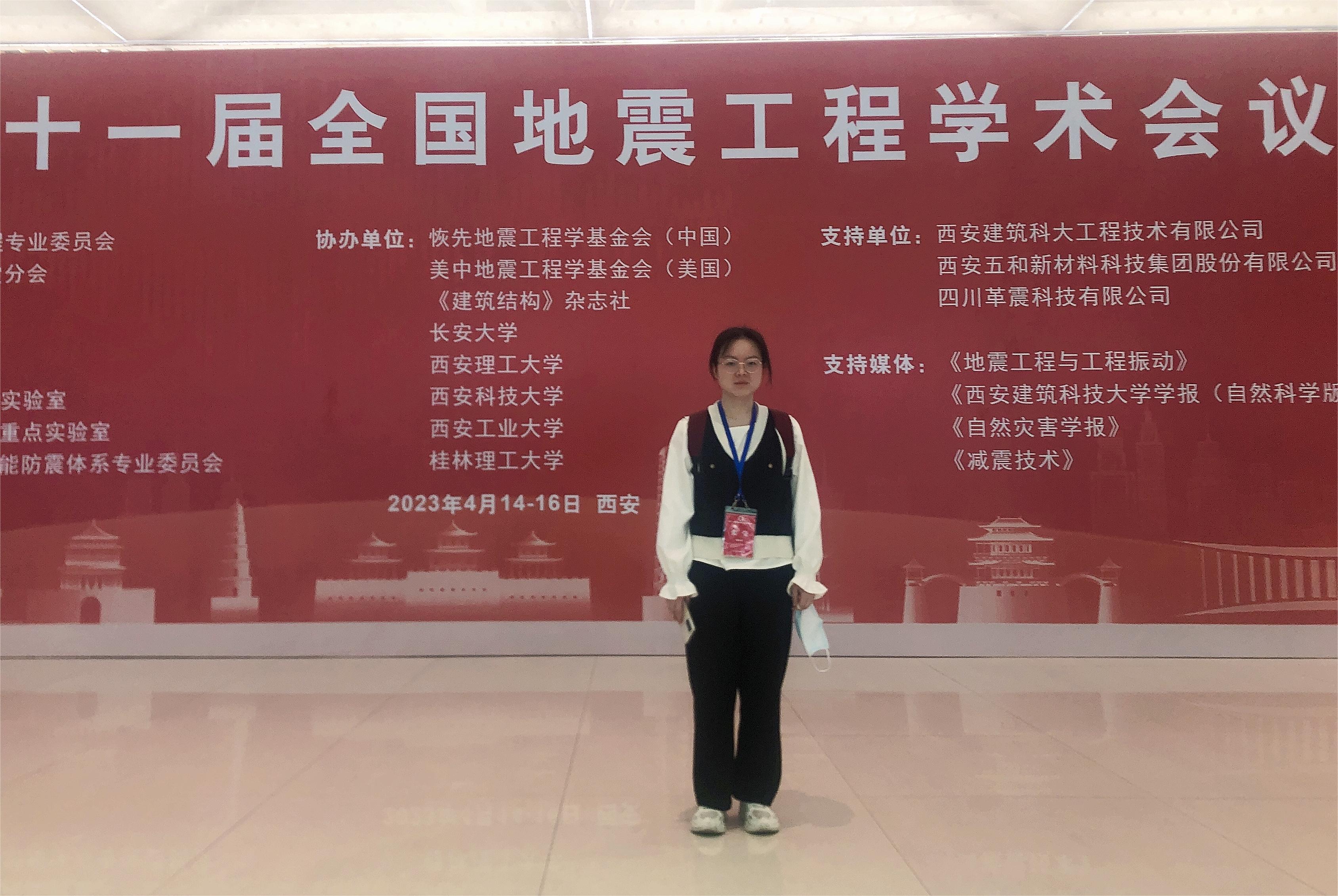 随着研究工作的拓展和深入,张莹同学意识到及时掌握本领域及相近领域的学术前沿和行业动态是非常有必要的。因此,早在研究生第一学期,张莹同学就积极投稿了一篇会议论文并于23年4月赴西安参加了“第十一届全国地震工程学术会议”。一同赴会的不仅有该领域内的知名专家和相关学者,亦有各大高校的师生和相关企业人员,本校机电工程学院,土木与交通学院、港口海岸与近海工程等学院也有许多老师积极参加。为了锻炼自己的语言表达能力,张莹同学主动申请了题为“含负刚度的惯容减振系统参数优化设计”的分会场汇报,报告内容涉及减振邻域的研究背景、新型减振元件的发展以及她在研究生期间所做工作的总结。通过此次汇报,张莹同学重新认识并审视了自己,深刻认识到了自身存在的不足。同时,主会场和分会场的知名地震工程专家,高校老师,博士生及研究生的高质量分享,为张莹同学的研究方向提供了不少有价值的参考信息,启发了她的科研思路,让张莹同学进一步明确了研究目标,对自己未来的工作有了具体的规划。