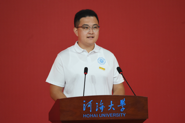 杨桂山为研究生新生代表水文水资源学院2024级硕士研究生崔腾飞佩戴校徽。崔腾飞作为新生代表发言,表示将肩负百年河海“大哉河海奔前程,毋负邦人期”的历史使命,植根河海,胸怀祖国,放眼世界,奋力书写为中国式现代化挺膺担当的青春篇章。