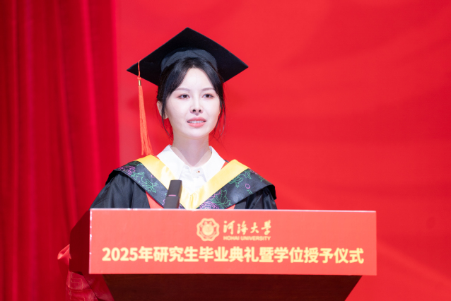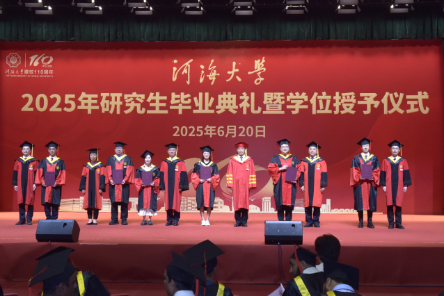 毕业生代表、电气与动力工程学院博士普月表达了对母校、领导和老师的崇高敬意和衷心感激之情,表示将承河海前人之志,心怀热忱、脚踏实地,以不惧挑战的勇气、持之以恒的毅力,在广阔天地中书写属于自己的时代答卷。