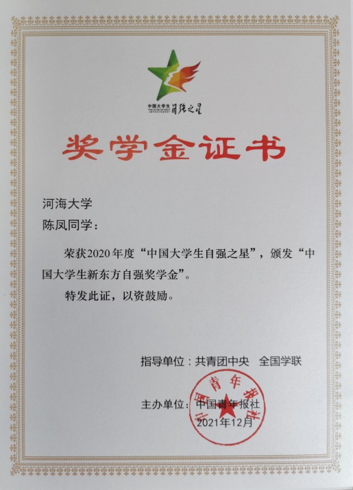 陈凤出生在汶川,经历过6次人生重大变故。从收到前总理温家宝的回信鼓励,到终于保研来到河海,她很荣幸,也很骄傲。她想:如果我真的是一只凤,那么河海就是我的醴泉。两年多的时间里,怀揣着一颗感恩之心,陈凤在真理中砥砺前行,在实践中学习真知,收获了新的进步和成长。