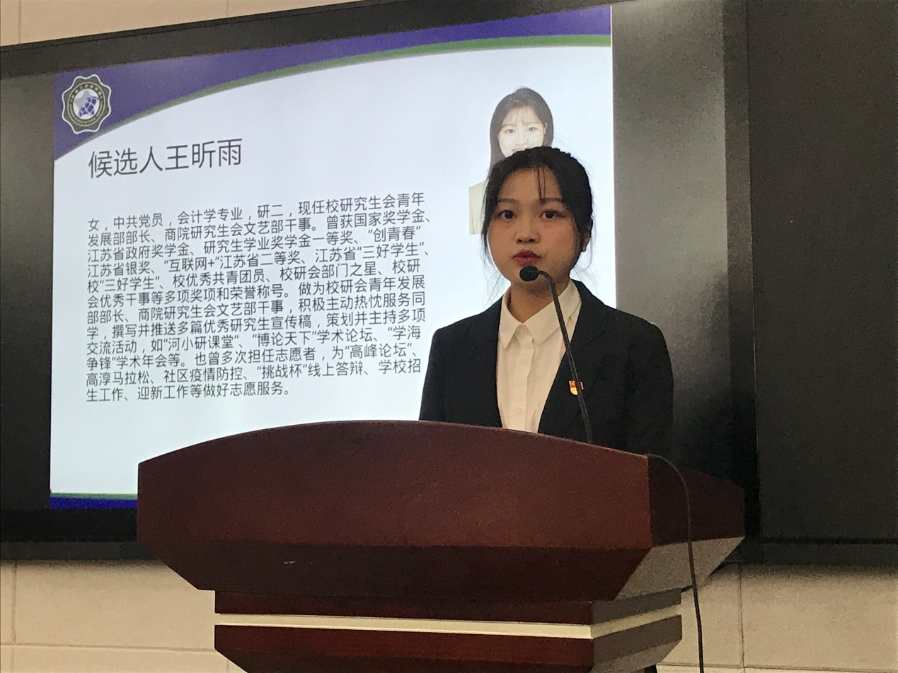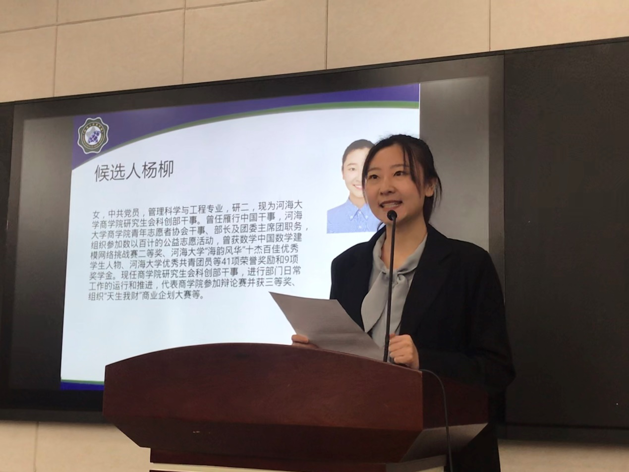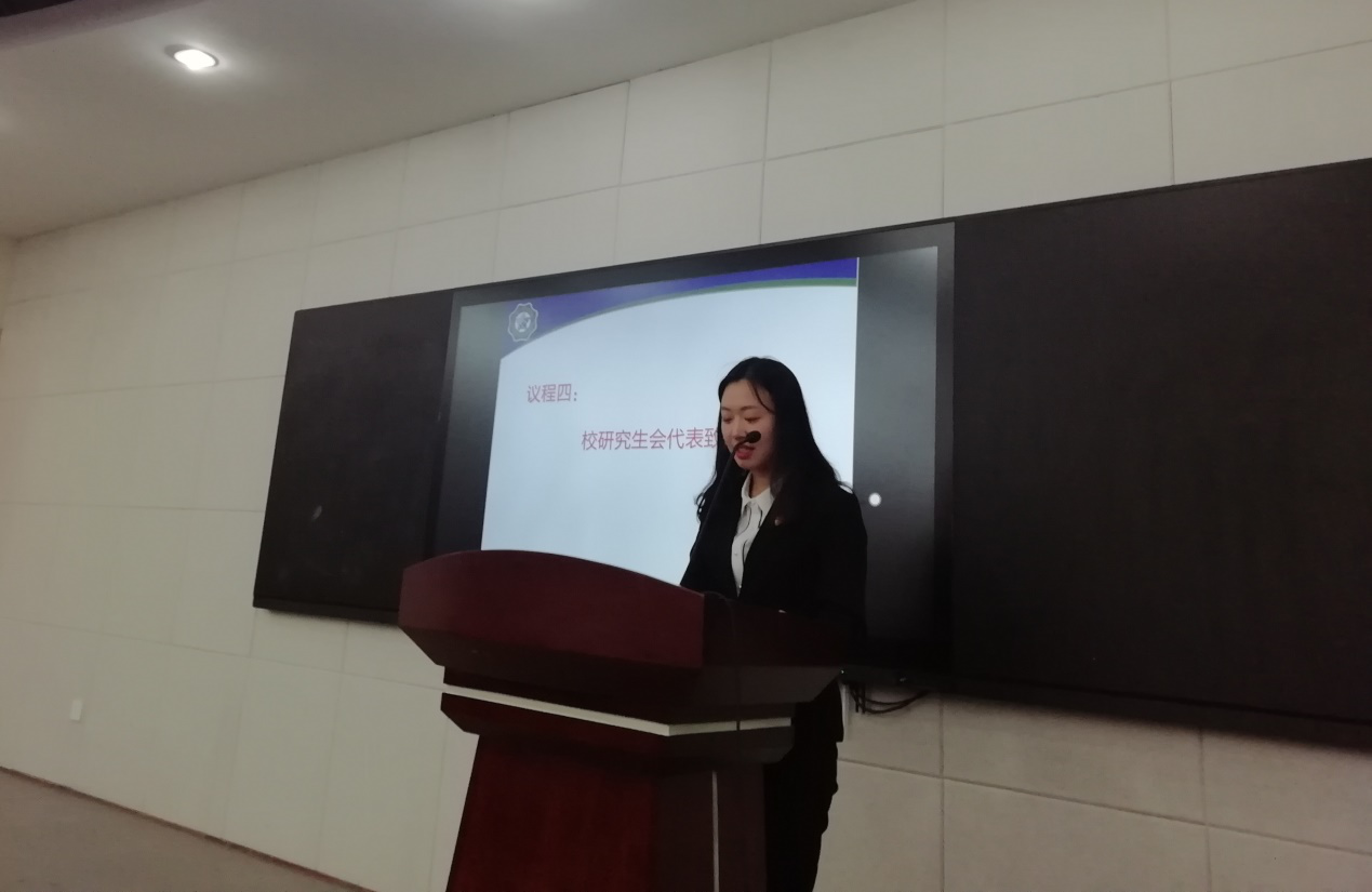 校研会代表杨一帆同学代表校研究生会发表讲话。她指出,商学院研究生会的各项工作都交出了满意的答卷,在思想引领、学术科研、社会实践等多个方面取得了优异的工作成绩。同时,她希望商学院研究生会紧跟时代步伐,进一步加强组织建设,不断创新工作思路,着力提高服务水平,努力开创研究生会工作的新局面。