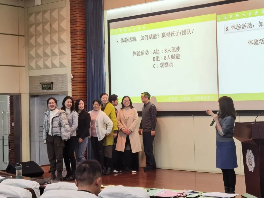 讲座后半段,白老师设计了“握拳打开”体验活动,旨在告诉学员交流的重要性。当涉及如何向孩子赋能、体验孩子感受的问题时,白老师提出一个具体的团队案例——“效果欠佳读书会”,引发学员们的热烈讨论。最后,为了让学员更直观地感受正面管教的作用,白老师设计了一个活动——让一个学员扮演孩子,选择16位学员分别扮演正面管教的父母和强势的父母,其他学员观察活动过程。活动结束后,所有学员都产生了深刻感悟,认识到对孩子进行正面引导的重要作用。