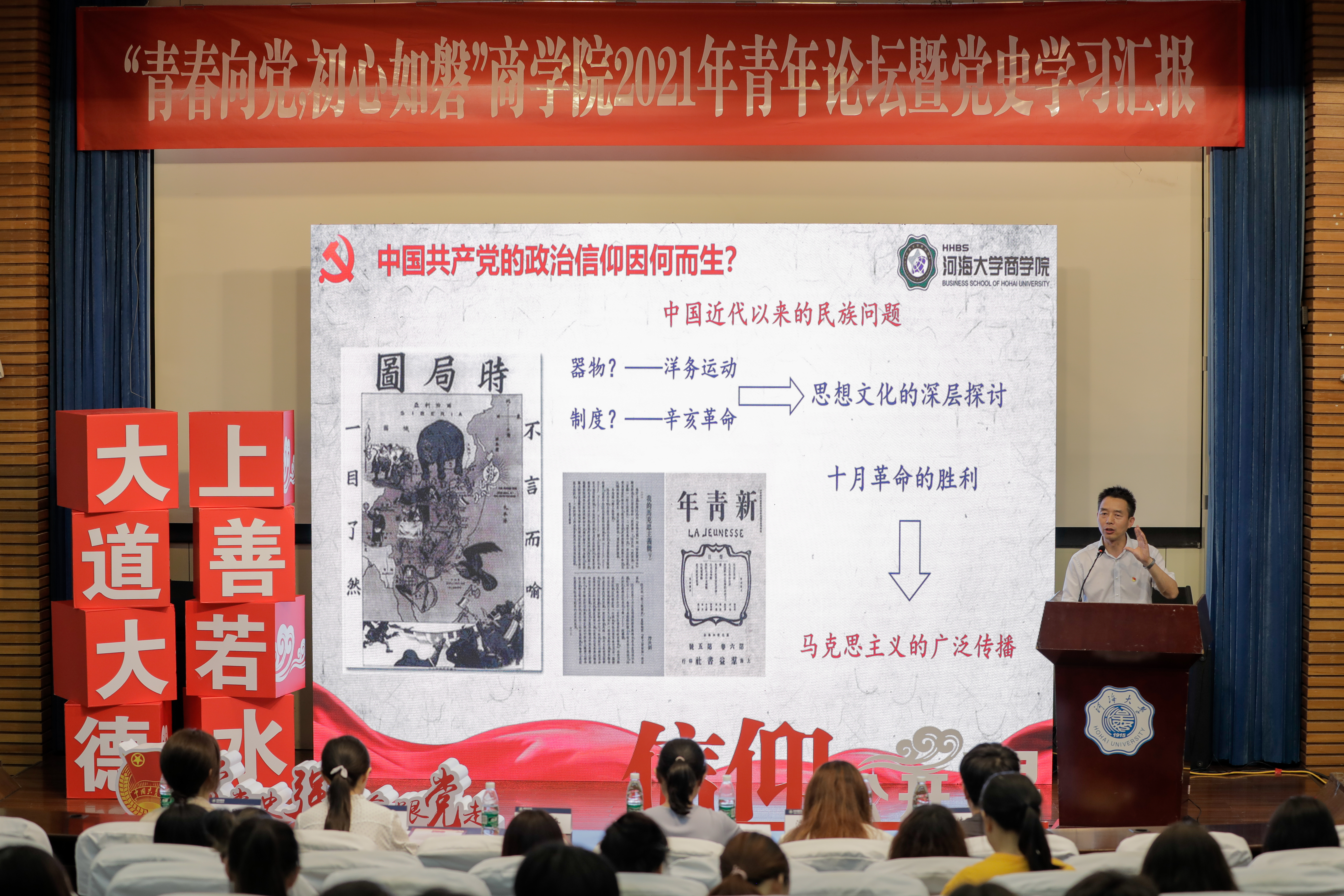 学院党委吴宝海书记为同学们讲述了一堂深入人心的主题党课《在党史学习中筑牢青年马克思主义信仰》。他从“中国共产党的政治信仰因何而生?”这一问题引入,为同学们讲述了中国共产党百年历程中的“四件大事”——开天辟地、改天换地、翻天覆地、惊天动地,生动讲述了中国共产党一经成立就把实现共产主义作为最高理想和最终目标,确立起为中国人民谋幸福、为中华民族谋复兴的初心和使命。同时以习近平总书记对青年的希望与嘱托为指引,希望同学们学史明理、学史增信、学史崇德、学史力行,做堪当民族复兴重任的新时代河海商科青年!