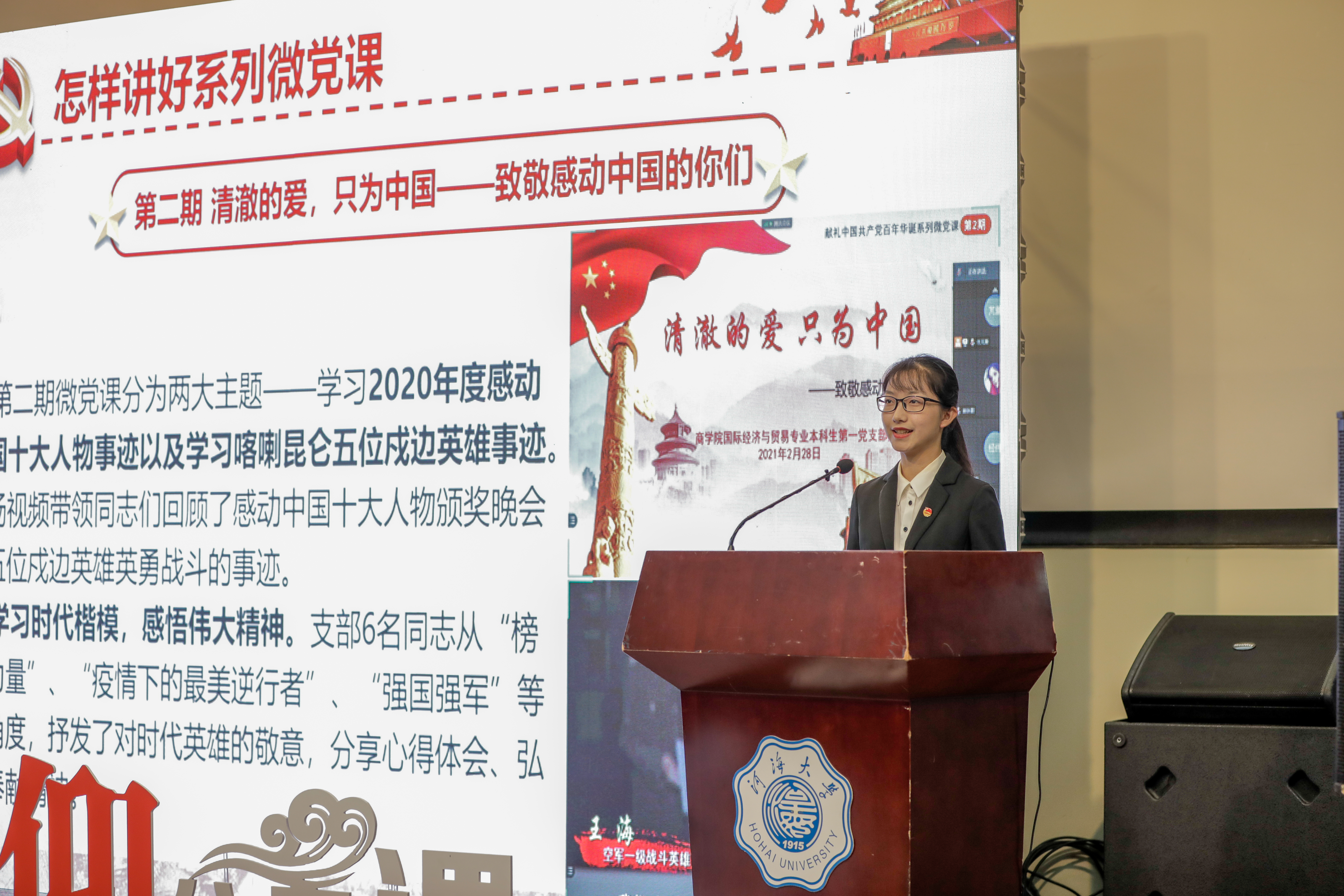 学院团学骨干代表赵培培、陆瑶、魏然、吴亚添、李林等同学朗诵《思我辈今日安乐,感念前辈艰苦之奋斗》。工程管理专业本科生党支部窦睿同学、国际经济与贸易本科生第一党支部姚可越同学、2020级硕士第二团支部书记梁伟婷同学分别从党史学习、党课宣讲、党日活动等方面,分享了党史学习主题活动的心得体会。活动最后,全体师生重温入团誓词,齐唱《歌唱祖国》,表达了对祖国母亲、对中国共产党的感激和热爱之情,充分感受中国共产党波澜壮阔的百年征程和历久弥坚的百年初心。