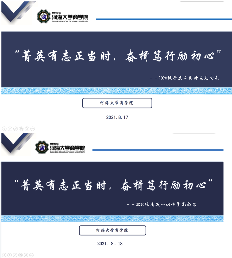2021年8月17日、18日,2020级菁英一、二班分别在线上召开了“菁英有志正当时,奋楫笃行励初心”师生见面会。菁英一班班导师高辉老师、二班班导师李祎雯老师,商学院团委书记陈璐老师、2020级辅导员赵晨洁老师以及2020级菁英班全体成员参加本次会议。