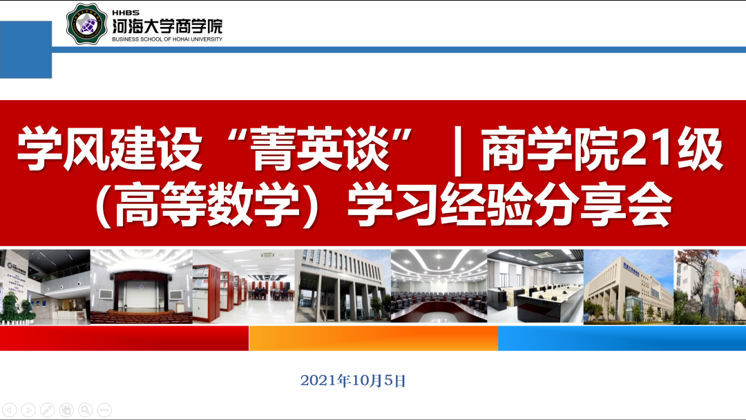 为帮助21级新生对高等数学课程有全面而清晰的认知,更好地掌握高等数学的学习方法,10月5日晚,商学院利用国庆假期开展了“学风建设‘菁英谈’”系列活动之高等数学学习经验分享。此次经验分享活动,邀请到6位2020级高数学习优秀的本科学生进行交流分享。在南京就读的全体21级商学院新生于线上参加活动,21级辅导员陈鹏老师到场,本次活动由21级人力2班学习委员陈雪阳同学主持。