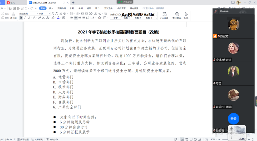 10月3日下午,2018级开展无领导小组面试模拟活动,本次活动邀请了景瑞地产(集团)有限公司HR、开云电竞网商学院2021届校友黄瑱担任面试官,2018级陈莹、陈欣怡、李翠林、佘月、曹金子、王凯祥、游雅婷等同学参加了本次活动。通过体验改编的2021年字节跳动秋季校园招聘无领导小组面试题目和面试的流程,同学们对无领导小组面试有了一定的了解,在模拟面试结束后,黄瑱同学介绍了自己在无领导小组面试过程中遇到的困难和积累的经验,以期自己的经验分享能够帮助到即将面临秋季校园招聘的学弟学妹们。