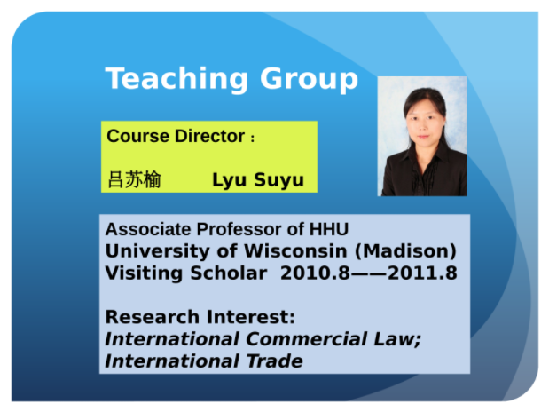 经过严格的评审和精心的开发建设工作,我院吕苏榆副教授的《国际商法/International Commercial Law》课程成功入选首批江苏高校省级外国留学生英文授课精品课程在线开放课程,即将在省课程网平台上线。本次同批入选的共有来自全省13所高校的15门课程。
