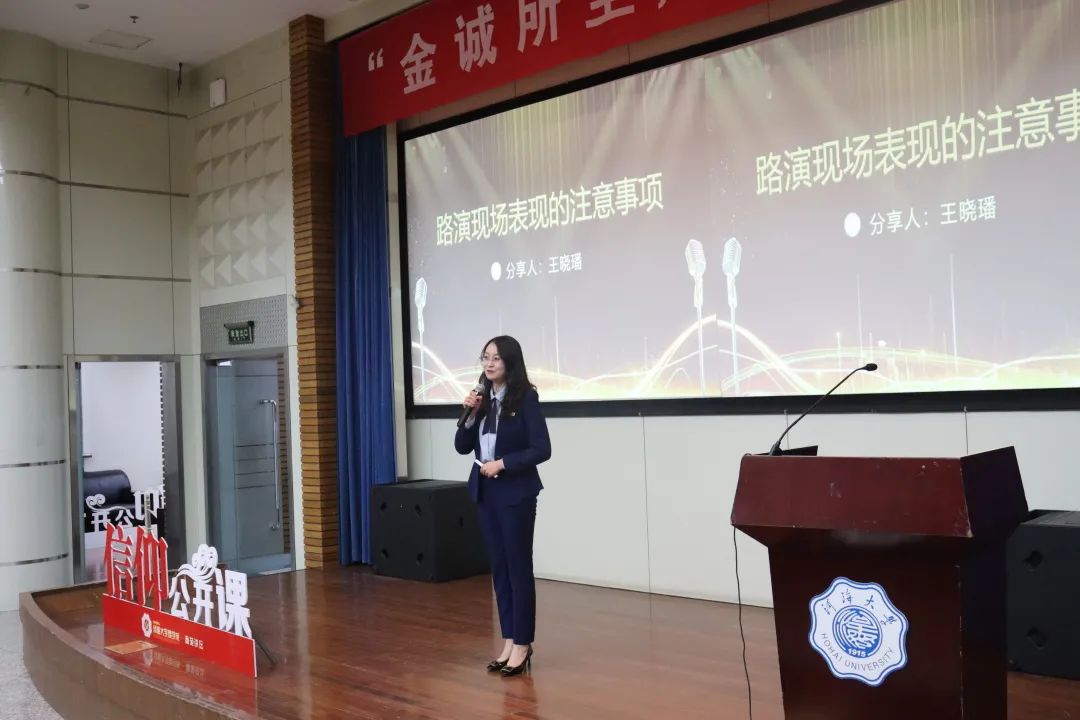 启动仪式第三项,在各大创新创业赛事以及商赛中取得优异成绩的同学进行现场路演与经验分享。第一位为同学们分享经验的是商学院MBA学生王晓璠,她所在团队的项目——“蓝鲸号”水下机器人在MBA创业大赛中获得全国八强的好成绩。曾获“互联网+”全国银奖的李沁如同学也为同学们带来了一场精彩的现场路演,李沁如团队的项目——“崇新数字”同样致力于解决市场痛点,这样一款基于“区块链+AI智能合约”的数字文化产品交易分发一站式平台具有“用户上传即存证确权,维权更便捷智能,定价有参考”等技术亮点,现已获百万天使投资,并与20余家企业进行了合作。曾获“挑战杯”“互联网+”省赛二等奖的梁岚同学分享了她所在团队的项目,该项目深耕国家政策,关注民生福祉,致力于解决渔民的民生难题。在三位同学讲解完创新创业赛事后,杜佩恒同学为同学们分享了他对ERP沙盘大赛的想法。最后,李林同学为同学们带来了危机公关大赛的经验分享。