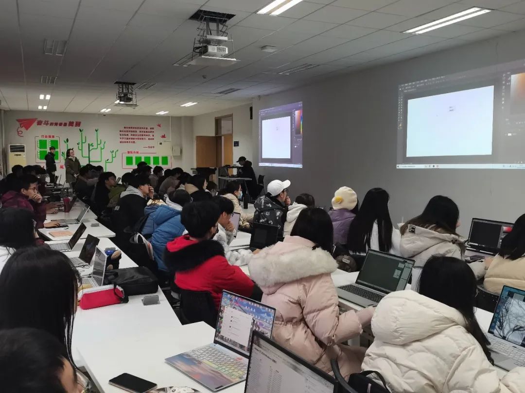 朱威昱同学首先介绍了有关PS的基础知识,引入图层的概念,以及PS的主要功能,包括图片参数、创作工具、快捷键的使用等等。为了让大家更深刻地感知这一软件的使用,朱威昱同学使用三张图片分别演示了色相色阶饱和度调整、图像去除斑点、校色调色、更改图层样式和不透明度等参数的使用,并在过程中讲解相关原理,提醒同学们在使用过程中可能会遇到的问题。接着,朱威昱同学以同样的思路向同学们讲解并展示了PR的使用。同学们也跟随着朱威昱同学的讲解在自己的电脑上进行实操,真正地将培训内容落到了实处。