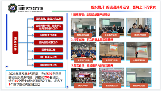 学院团委副书记郑鸿斌围绕思想引领、组织提升、实践育人、志愿服务和宣传文化5条主线,系统总结了商学院团委在2021年度取得的工作成绩与规划设计了2022年度的工作计划。2022年度,学院团委将以喜迎党的二十大、庆祝建团100周年等主题作为工作重点,以培养具有坚定信念、创新精神和实践能力等素质的新时代青年人才为工作目标,紧贴现实需要,发挥好桥梁和纽带作用,组织开展大学生素质拓展、校园文化、社会实践、志愿服务等活动。