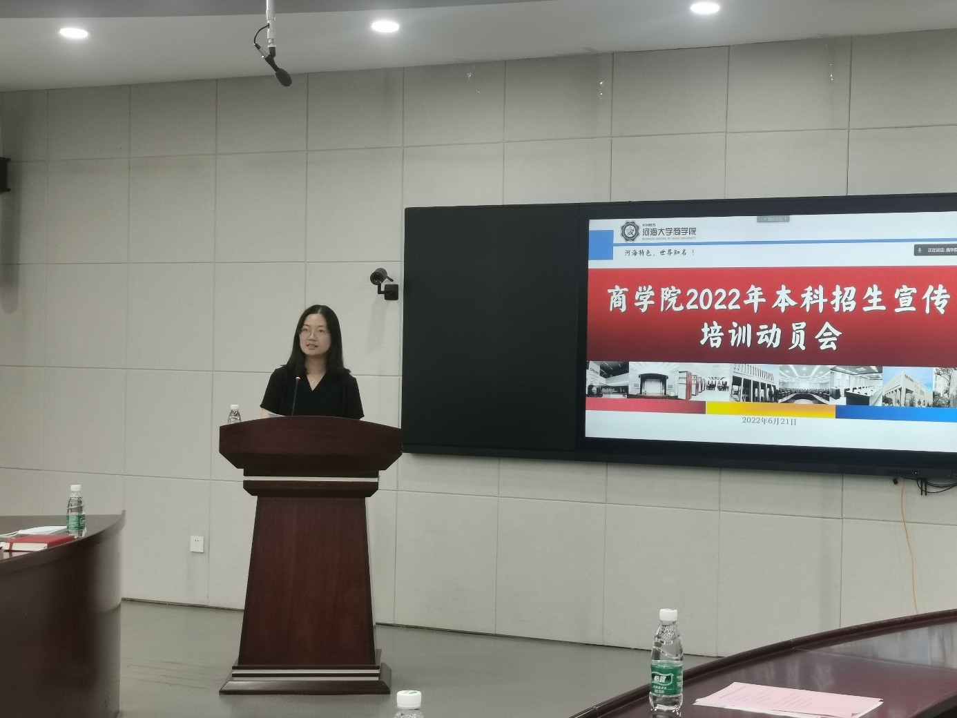 为做好2022年本科招生宣传工作,6月21日下午,学院在博学楼辅楼A100组织召开了2022年本科招生培训动员会,动员会邀请到开云电竞网学生处、招办主任蓝崑副处长做培训动员,商学院党委吴宝海书记、学院其他领导班子成员,各系主任、各系党支部书记、各系今年参与实地招生的教师,以及全体辅导员参加,学院常州校区师生于线上参会,会议由学院党委戴媛媛副书记主持。