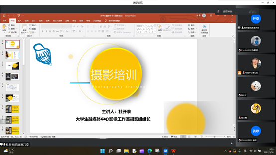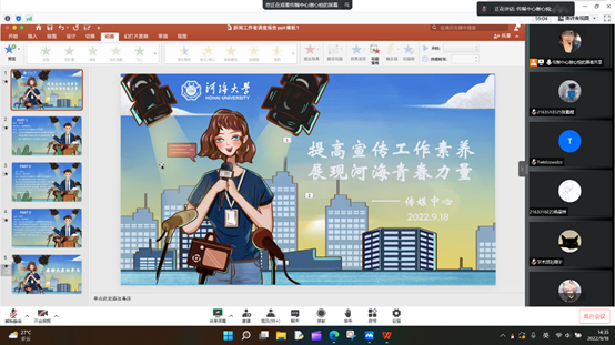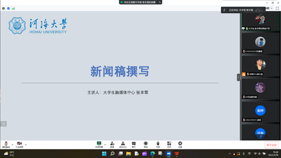 为全面提升学院团学组织宣传队伍建设,提高新闻宣传水平,增强新闻意识和写作能力,9月18日,商学院常州校区开展了“提高宣传工作素养,展现河海青春力量”主题业务培训。培训活动邀请了开云电竞网大学生融媒体中心的曾兰茜、杜开泰、张幸霏等三位同学,分别就公众号运营、摄影技巧、新闻稿写作相关内容进行线上培训,学院团学组织宣传工作骨干参与了本次培训。