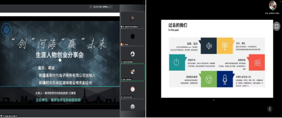 为增强学生的创业意识,提高创业能力,10月15日,商学院在线上举办“创”河海,“ 赢”未来生涯人物创业分享会,本次分享会邀请了创业伉俪---学院2017届国际经济与贸易专业校友蒋涵和田苗担任嘉宾。蒋涵现任新疆速易时代电子商务有限公司创始人、新疆阿克苏地区湖南商会常务副会长蒋涵,学院2017届国际经济与贸易专业校友、新疆故土新归文化发展有限公司创始人田苗担任嘉宾。500余名在校生在线参加了本次分享会。