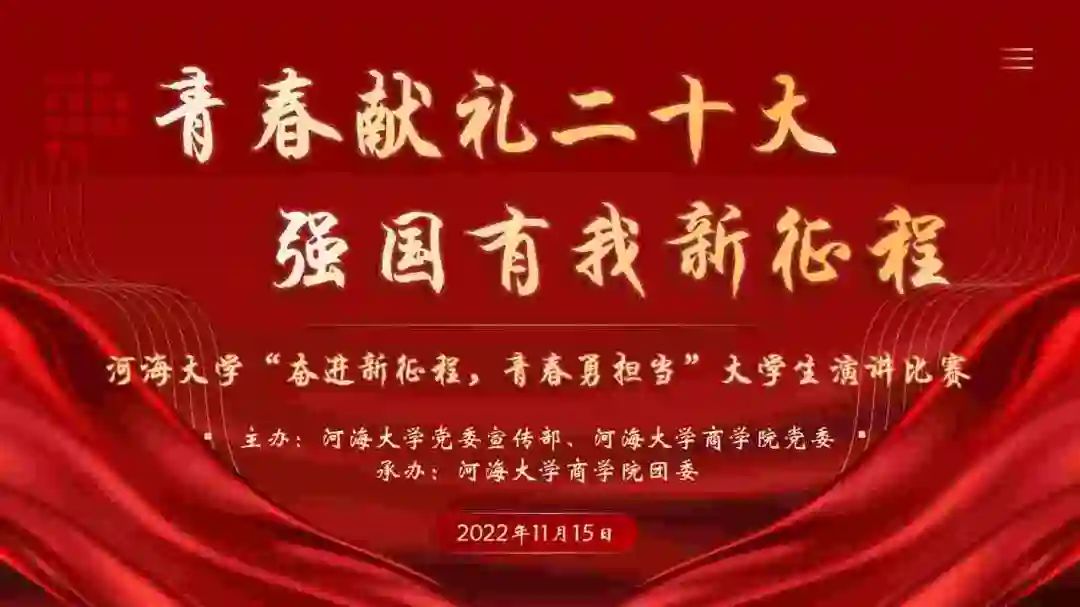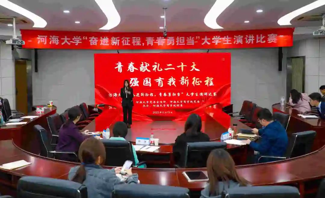 为深入贯彻习近平新时代中国特色社会主义思想,认真贯彻落实中国共产党第二十次全国代表大会精神,根据教育系统“青春献礼二十大,强国有我新征程”迎接学习宣传党的二十大主题宣传教育活动安排,由党委宣传部、商学院党委联合举办的“奋进新征程,青春勇担当”演讲比赛于2022年11月15日在江宁校区博学楼A100成功举办。