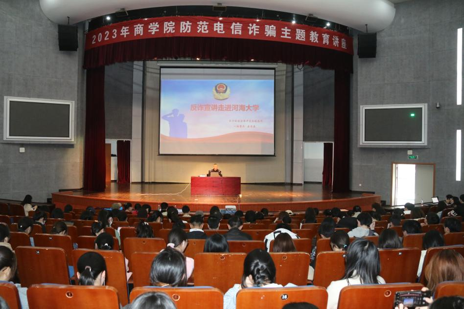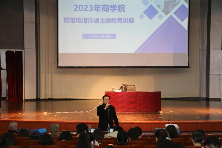 为进一步提高学生防范电信诈骗意识,切实保障学生的财产安全,3月14日下午,我院在博学楼报告厅举办2023年防范电信诈骗主题教育讲座。讲座邀请了江宁开发区派出所驻高校民警娄军来警官主讲,校保卫处副处长吴青山、院党委副书记杨天以及商学院本科生、研究生参与讲座。