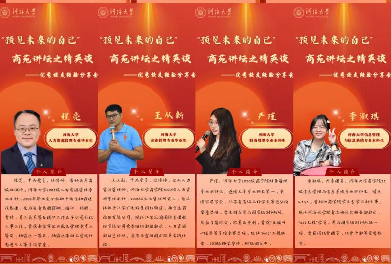 第三会场面向23级大数据管理与应用、工商管理、国际经济与贸易和金融工程专业的同学们,由洪楚悦、王鑫璞、史东骏、江越四位优秀校友代表主讲,徐小雨同学进行主持。