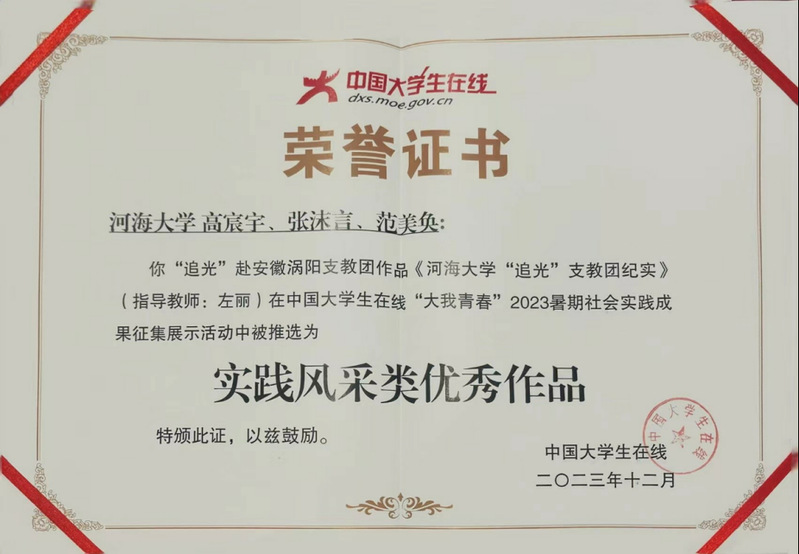 学院“追光”赴安徽涡阳支教团社会实践队作品——《开云电竞网“追光”支教团纪实》获评实践风采类优秀作品。