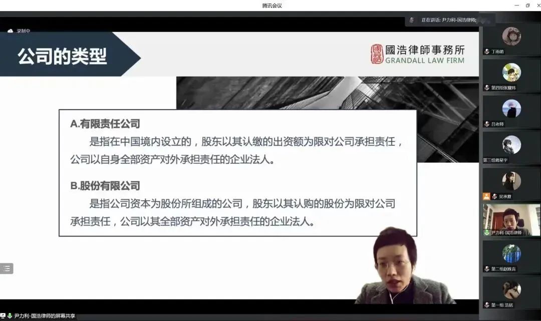 讲座开始,尹力利律师先为营员们介绍了公司的两种类型:有限责任公司和股份有限公司,并对这两种类型公司的不同之处做了说明:前者公司股东以其认缴的出资额为限对公司承担责任,而后者以其认购的股份为限对公司承担责任。这让营员们对公司的基本知识有了初步了解。