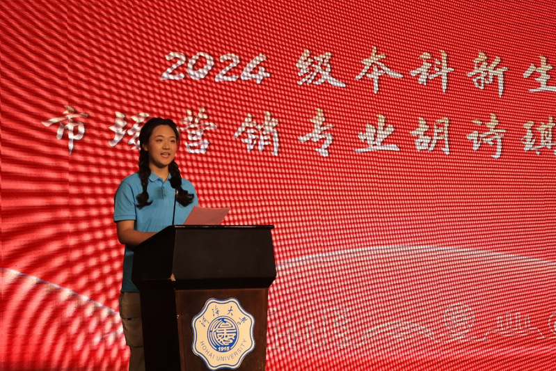 2024级市场营销专业的胡诗琪同学作为新生代表,在发言中郑重承诺:全体24级新生将坚定理想信念,传承和发扬校训精神,勤奋学习,勇于探索,身体力行,致力于成为具有社会责任感、创新创业能力和可持续发展能力的高质量“商科+”人才。