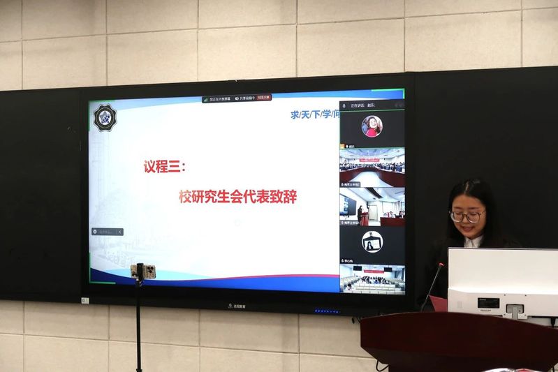 校研究生会代表田梦婷同学对大会的召开表示了热烈祝贺,充分肯定了商学院研究生会过去一年所取得的成绩,并对研究生会未来工作提出了期望。