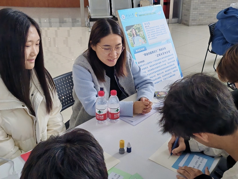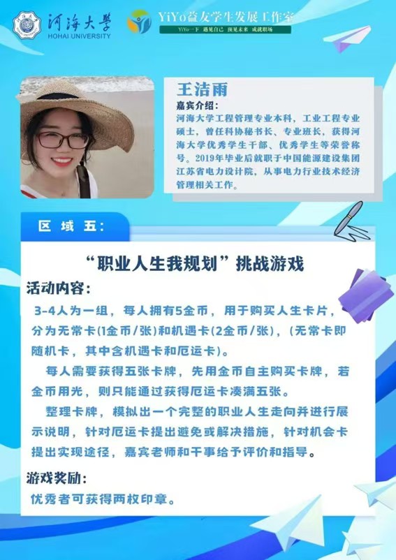 “职业人生我规划”挑战游戏以抽取生涯规划卡片的形式,模拟出完整的职业人生走向,引领同学们体验职业人生的起伏和规划,锻炼应对职场及人生中不同突发情况的能力。嘉宾王洁雨老师对同学们的表现进行了点评指导,并分享了自身的教育经历以及求职经验。在虚拟的职业人生体验中,同学们对于未来职业人生的规划更加明晰,逐步掌握灵活应对生涯挑战的能力。