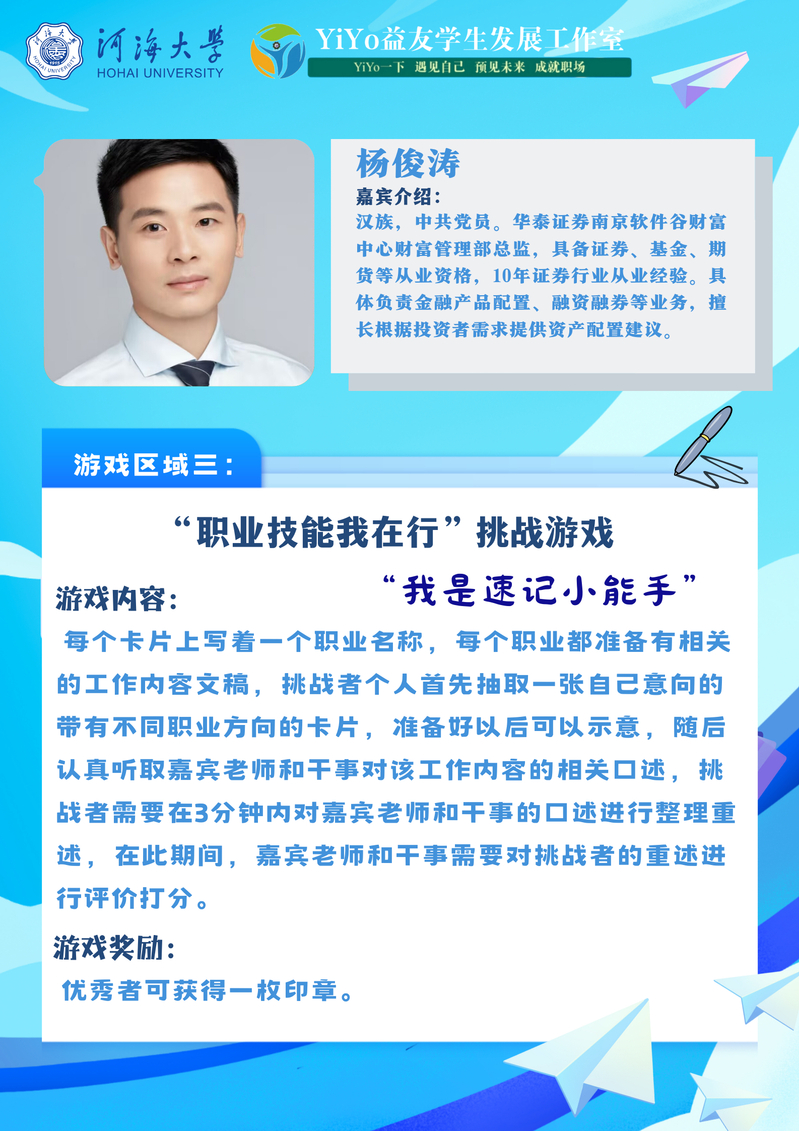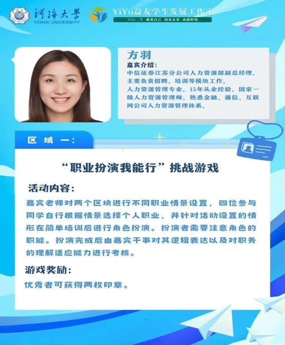 为加强同学们的自我认知、辅助生涯决策,开云电竞网就业指导中心和商学院YiYo益友学生发展工作室于2024年11月19日下午在江宁校区商学院大厅成功举办了开云电竞网生涯体验日活动之“商”海扬帆·“职”向未来生涯体验嘉年华。本次活动以职业生涯体验为线索设置了四个主题游戏,分别是:职业扮演我能行、职业未来我做主、职业技能我在行、职业人生我规划。活动以寓教于乐的生涯游戏为同学们搭建了一个别开生面的平台,助推同学们点燃拼搏激情,增强职业领悟。商学院、法学院、体育系近400名学生参与了本次活动。