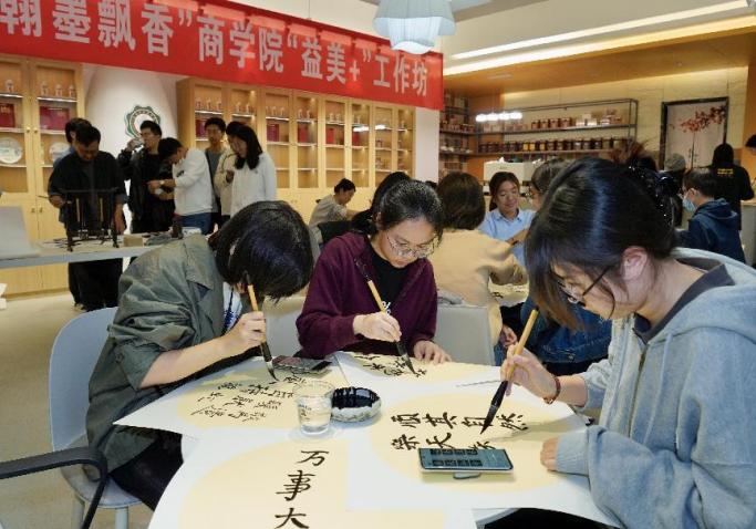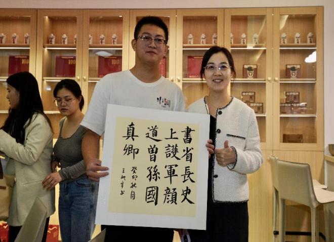 活动开始,杨六平、田延风与学生一起参加了“丹青溢彩 翰墨飘香”商学院“益美+”工作坊举办的书法辅导交流活动。活动中,田延风现场创作,一幅幅遒劲有力、气韵生动的书法作品,让在场师生感受到了书法艺术的独特魅力。杨六平从专业的角度对现场学生作品做了点评,同学们兴致高昂,积极参与,完成创作后相互鉴赏交流,最后大家拿着作品与专家合影留念。