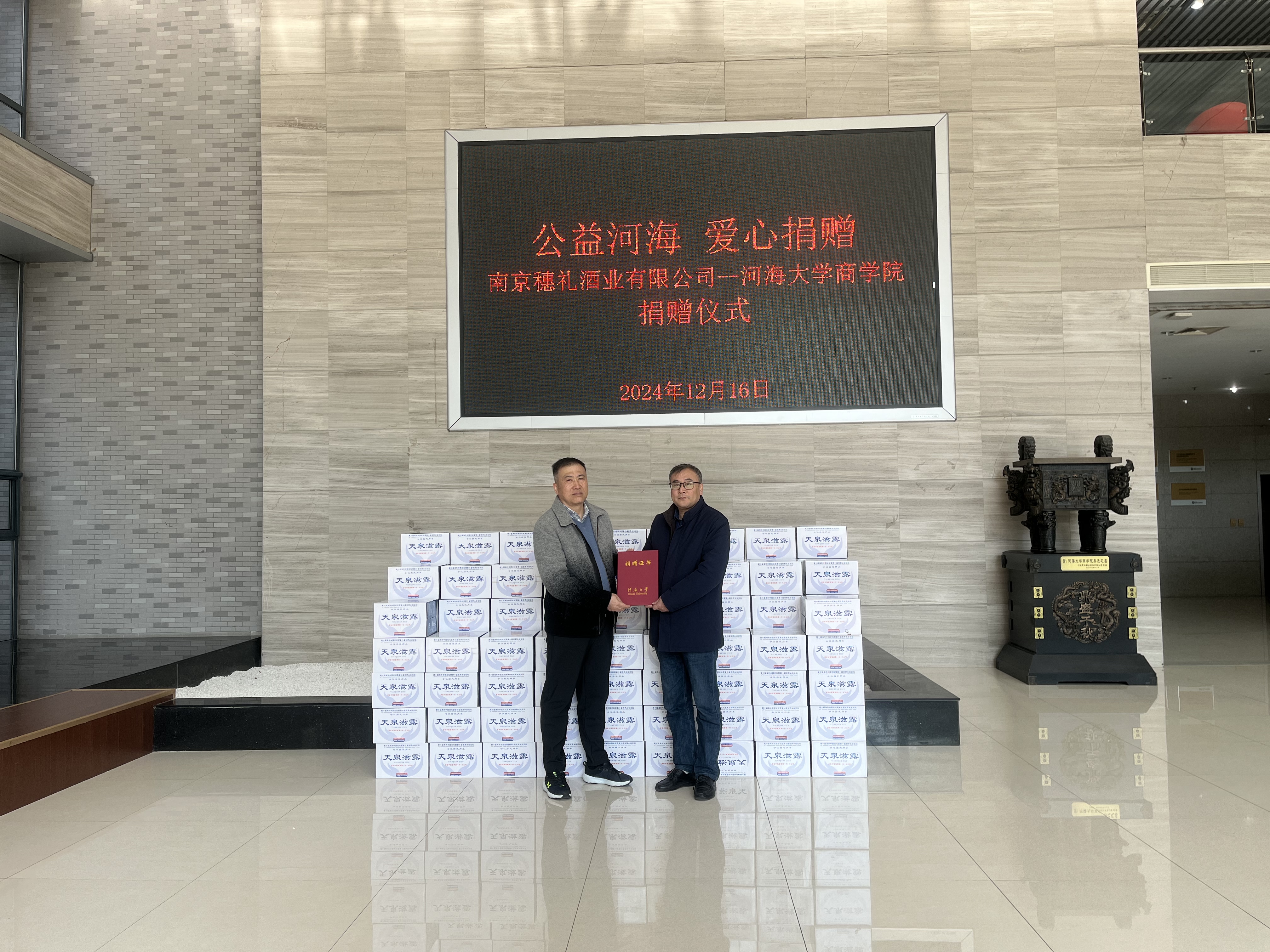 2024年12月16日,2006级MBA校友刘焕智创办的南京穗礼酒业有限公司向商学院实物捐赠,旨在支持学院举办的讲座、论坛等一系列活动。学院党委书记陈杰、副院长张长征、校友工作负责人郭祥林、院长助理李婕出席活动。
