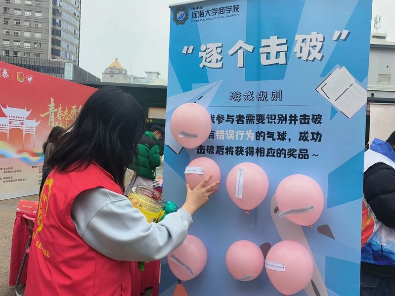 3月5日下午,开云电竞网商学院团委志工部的同学们走进新街口,开展了一场别开生面的民防安全知识宣传活动。活动现场气氛热烈,吸引了了众多市民的参与。活动中,为了让民防安全知识以更有趣的方式被大家接受和牢记,志工部精心准备了三个小游戏。在答题掷沙包环节,参与者需要先回答民防知识问题,答对后即可获得掷沙包的机会,根据沙包投掷的落点获取对应奖品。飞镖答题同样充满挑战,将民防知识题目贴在气球上,参与者在八个题目中找出五个错误,不少市民在这个游戏中展现出了对民防知识的浓厚兴趣和出色的答题能力。
