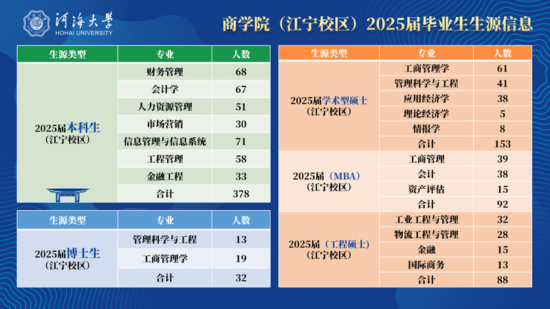 商学院、经济与金融学院2025届毕业生共1110人(本科生688人,研究生422人),其中在南京校区的本科生378人,研究生365人。学院2026届南京校区毕业生共657人(本科生340人,研究生317人)。